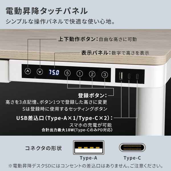 | サイズ | 本体サイズ:W1200×D600×H750~1250mm 重量:約37.8kg 耐荷重:80kg USB差込口:Type-Ax1、Type-Cx2 コード長さ:2.2m 梱包サイズ:W890xD270xH220mm/W1305xD705xH125mm |