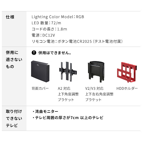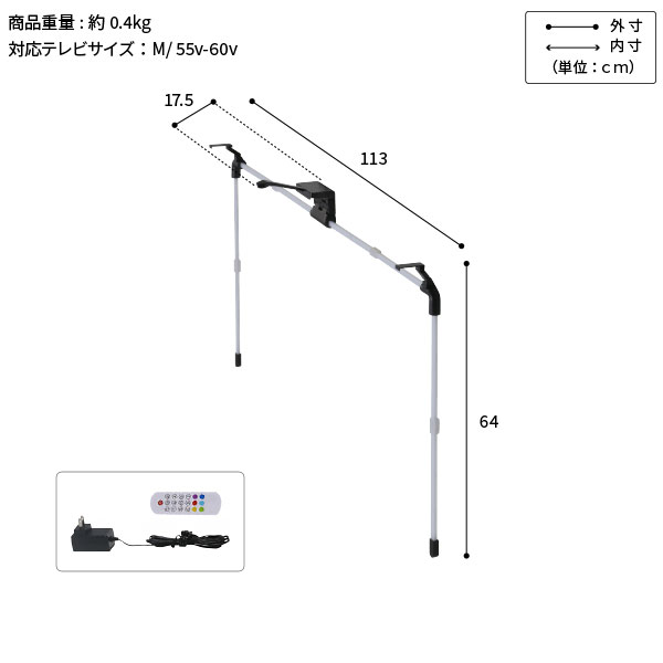 | サイズ | 本体サイズ:W1130×D175×H640mm 重量:約0.4kg 対応テレビサイズ:55v~60v 梱包サイズ:W345×D180×H70mm |