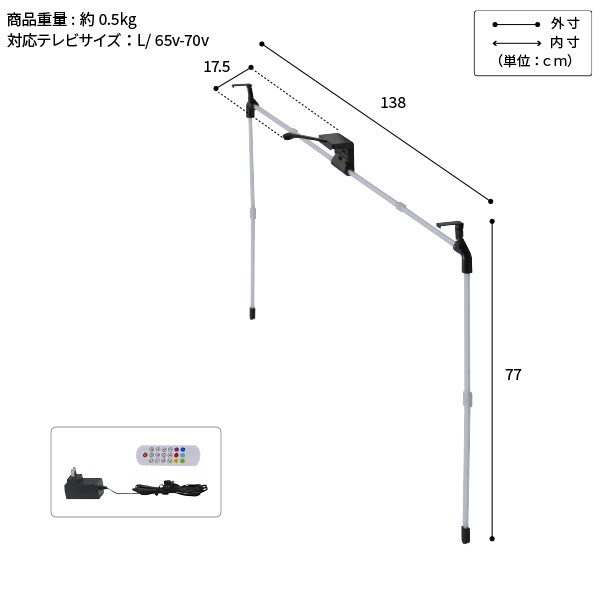 | サイズ | 本体サイズ:W1380×D175×H770mm 重量:約0.5kg 対応テレビサイズ:65v~70v 梱包サイズ:W400×D180×H70mm |