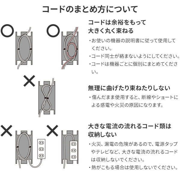 複数のコードもスマートに収納でき、配線が苦手な方にもおすすめです。