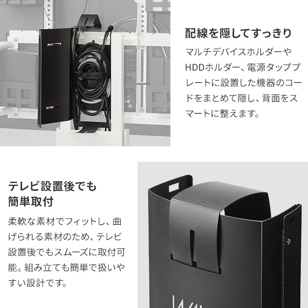 柔軟素材で、テレビ設置後でも簡単に取り付けが可能です。