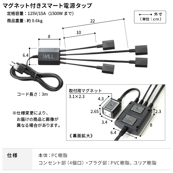 電源タップは本体とコンセントにマグネットが付いた独自構造。自由度が高く、